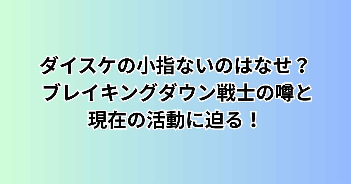 ダイスケの小指欠損の理由や反社会的勢力との関係については明確な情報が不足しており、確定的なことは言えません。彼に関する情報は主に噂や報道に基づいており、真相を知るためには、本人からの公式な声明や詳細な情報が待たれるところです。