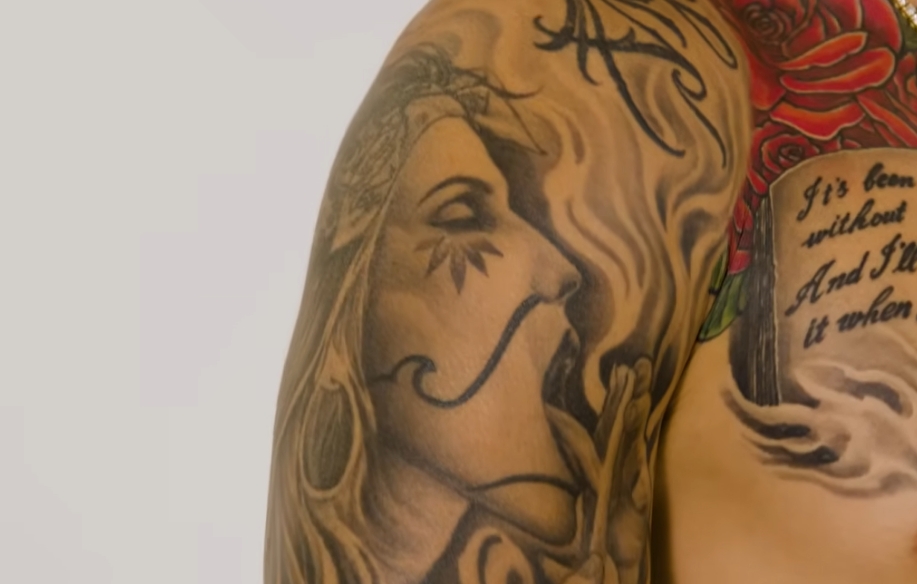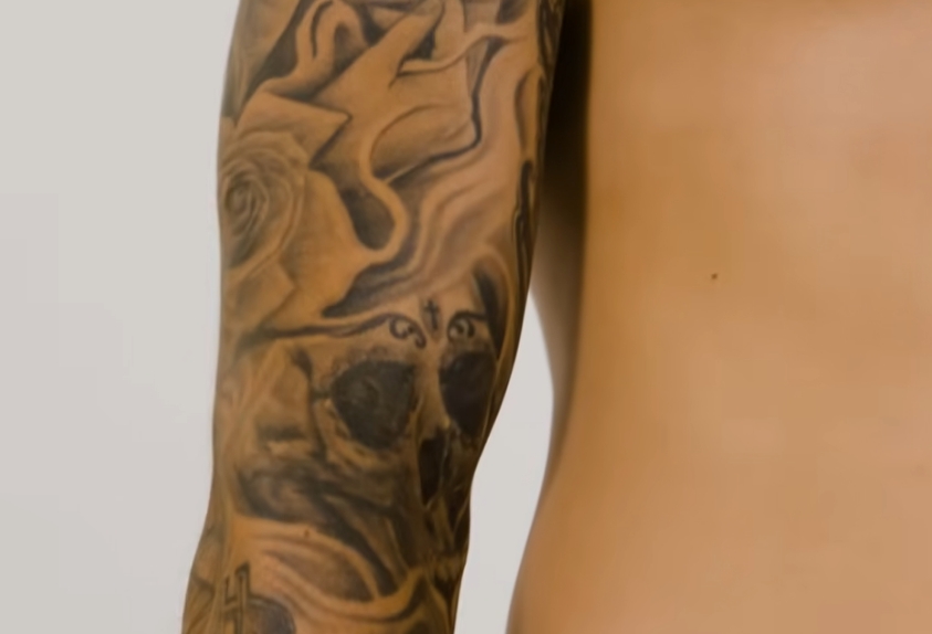 腕には「グロック」という銃のタトゥーが刻まれています。これは、伝説的なラッパー2PACが撃たれた際の銃がグロックだったという話を聞いて選んだもの。肘には骸骨と女性、そして煙のデザインが施されています。