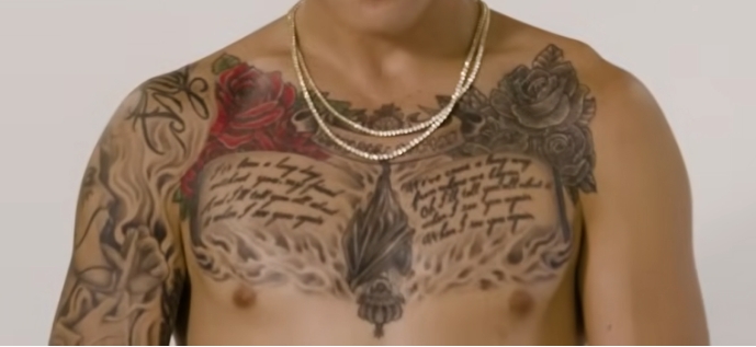 萩原選手のタトゥーの中で最も思い入れが深いのが、胸一面に刻まれたデザインです。これは23歳頃に入れたもので、小学生の頃から一緒だった親友を偲ぶために彫ったものだといいます。