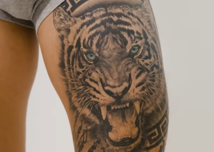 太ももには虎のタトゥーが入っており、これは萩原選手のお気に入りだそうです。虎の近くには文字が刻まれていますが、これは総合格闘家コナー・マクレガーの言葉を引用したもの。